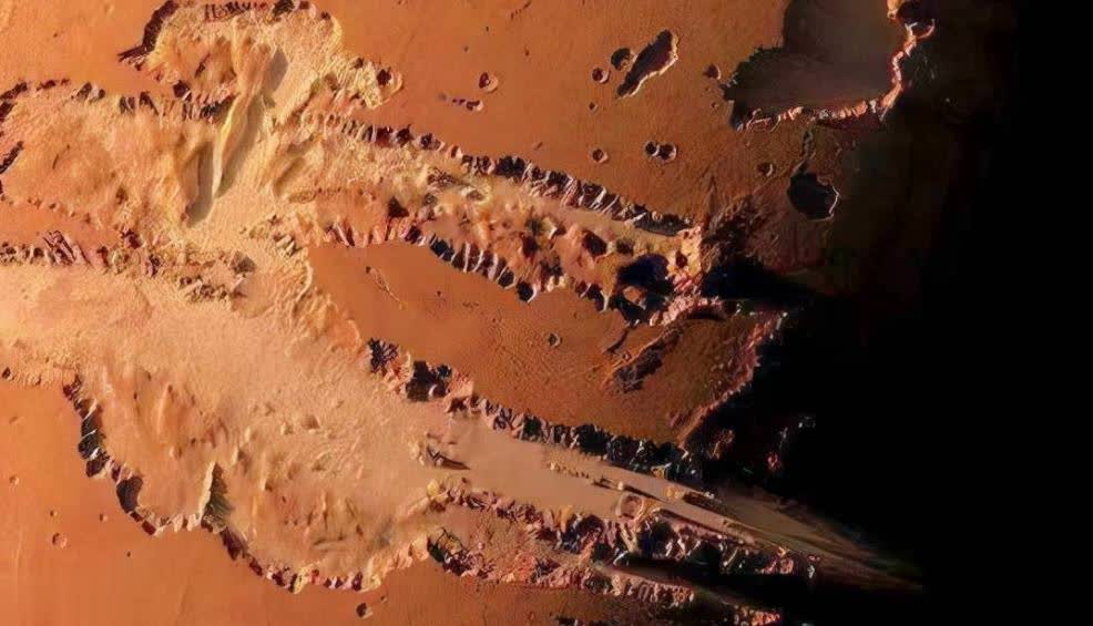 水手9号最大的发现是火星上一条绵延超过4000公里的超级大峡谷,这个巨大的峡谷,后来被以水手9号的名字命名为“水手号峡谷”。水手号峡谷的总长度超过了4500千米,4500千米长到底是什么概念呢?我们知道,火星的直径是6794千米,然而,水手号峡谷的长度却达到了火星直径的2/3,几乎达到了火星赤道长度的1/5 。和地球上最大峡谷雅鲁藏布大峡谷相比,是其9倍长。不但长度惊人,宽度和深度也是非常惊人的,其最宽处达到了600公里,宽度超过了雅鲁藏布大峡谷的长度,水手号峡谷深度上也超过了地球上最大峡谷的深度,达到了8千米。水手号峡谷,无论是从长度宽度和深度来看,都不愧是太阳系中的峡谷之王。从太空看上去,水手号谷仿佛是被一颗子弹擦肩而过留下的伤疤,十分的醒目和震撼。