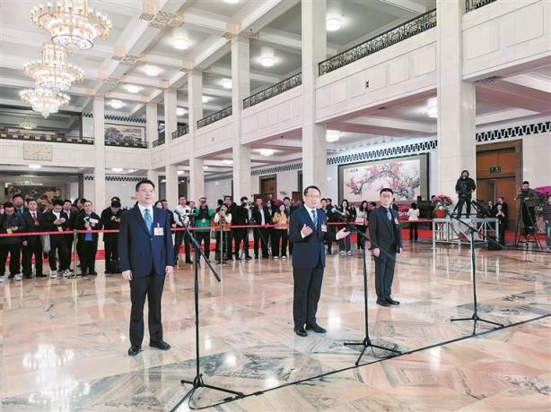 3月11日上午,全国政协十四届四次会议第三场“委员通道”在人民大会堂举行。图为全国政协委员刘成勇(左一)、徐坤、李心草(右一)接受媒体采访。文子玉 摄